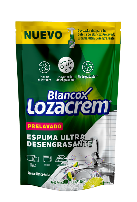 USO: Dosifique el doy pack en la botella de Blancox Lozacrem Prelavado Espuma Ultra Desengrasante.
