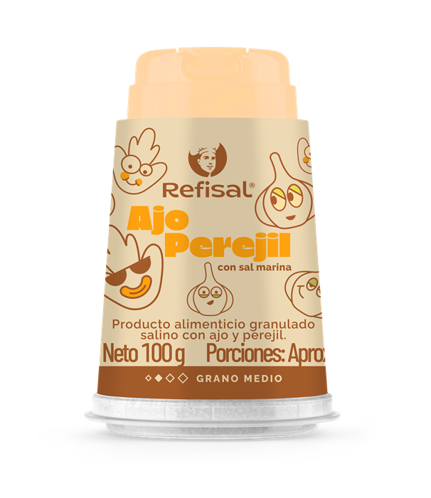 Sal marina (sal marina, fluoruro de potasio, Yoduro/Yodato de potasio y anticompactante (ferrocianuro de sodio (E-535))), ajo en escama, escamas de chimichurri, sabor natural ajo,